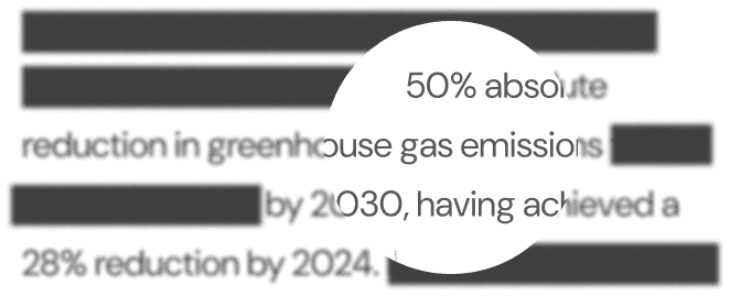 Our AI scans the web to uncover everything a company says about sustainability. From annual reports to blog posts, our intelligence engine automatically collects all relevant sustainability data across the web, giving you a complete, real-time view of a company’s sustainability story.