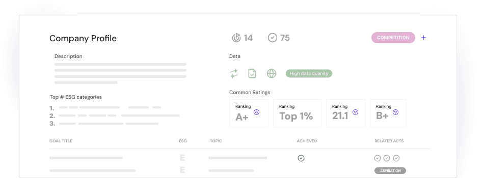 All sustainability acts, goals, ratings, and progress structured under one consistent framework, making companies instantly comparable.